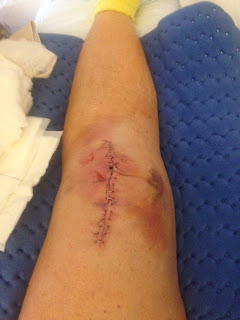 I wanted to share pictures of the knee because it is amazing how far I've come in 6 weeks! This first one was taken on my iPhone by the EMT in the ambulance on the way to the hospital. Ewee! Looks as painful as it felt! You can see the patella broken into two pieces. Broke it on April 1, but it was no April's Fool joke!